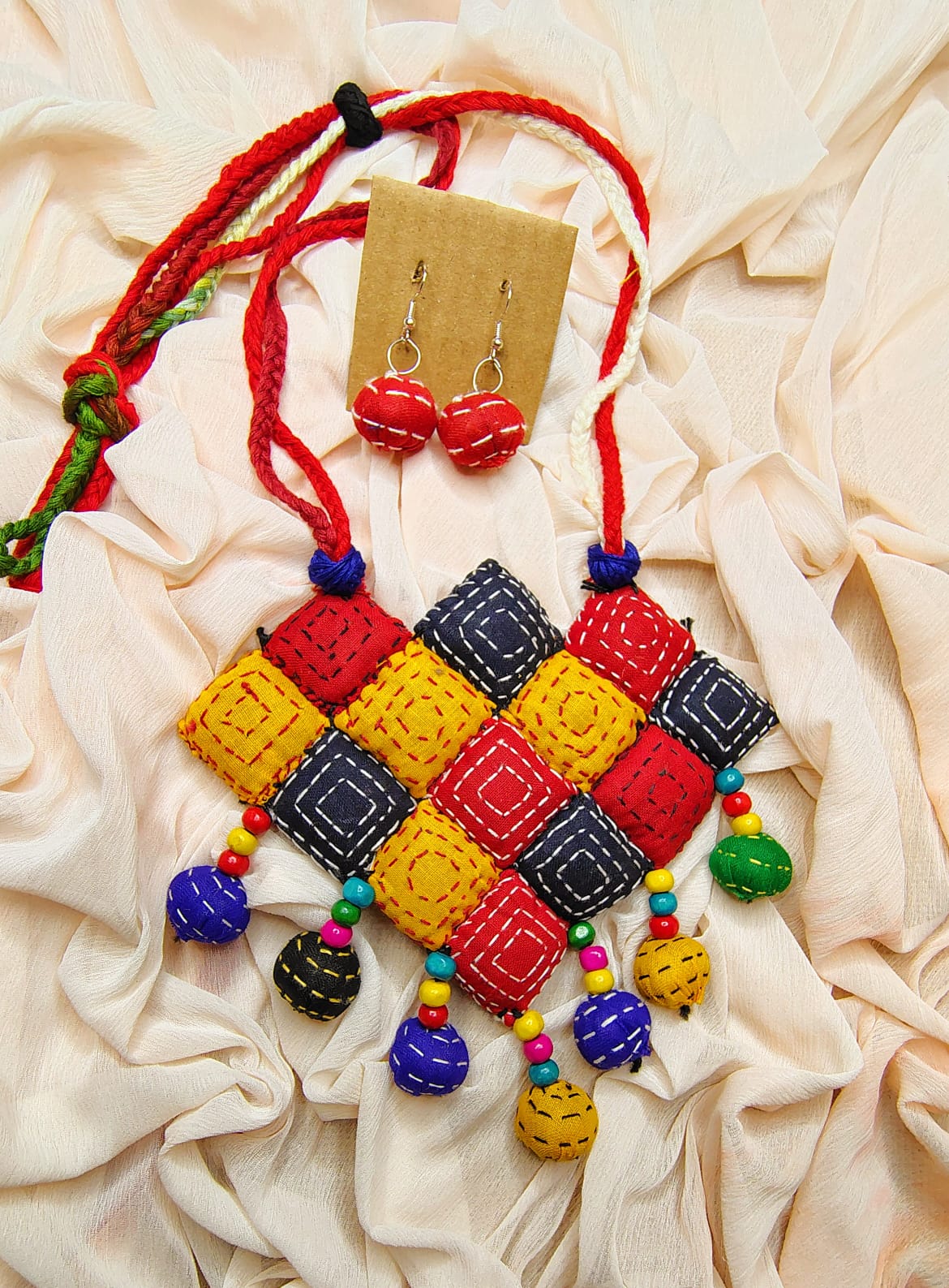 Add a pop of colour to your style with this vibrant handmade jewellery set crafted from soft fabric and traditional hand-stitching techniques. This unique ethnic necklace and matching earrings feature bold red, yellow, blue, green, and black geometric patterns adorned with colourful beads, making it a perfect statement piece for festive, cultural, and everyday wear.
